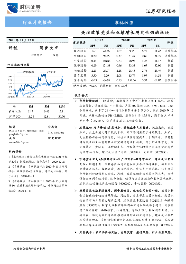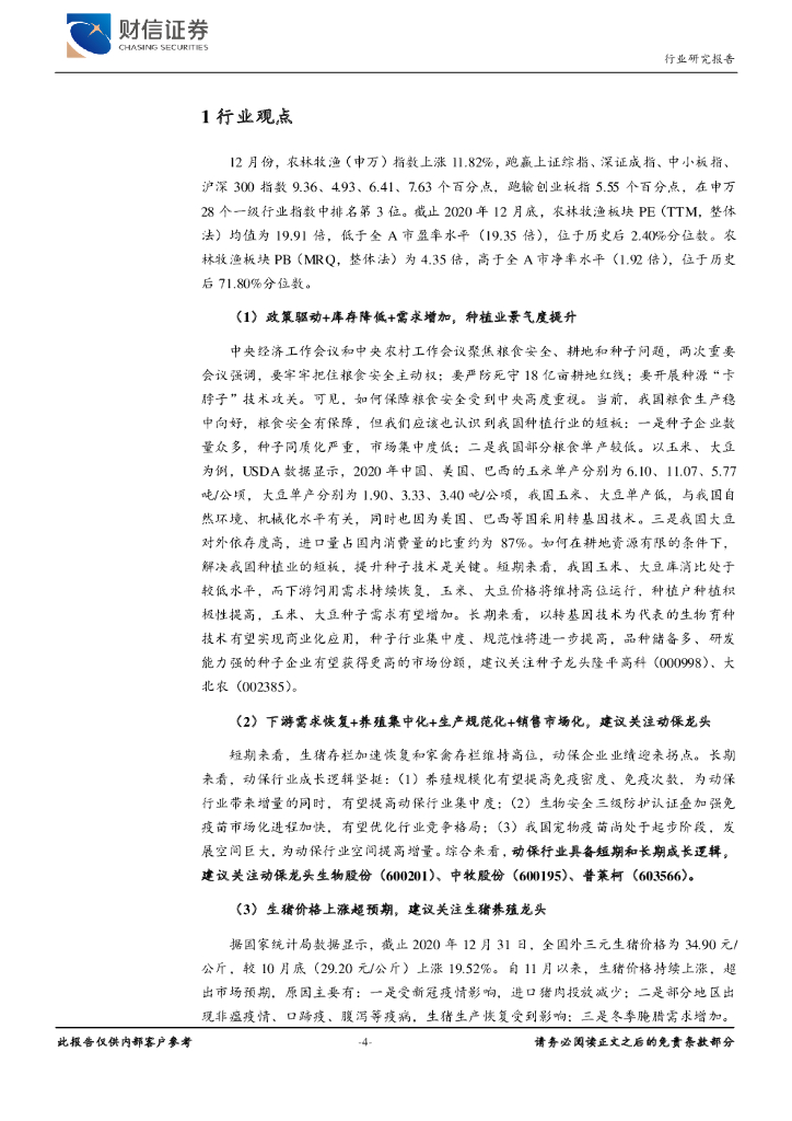财信证券:农林牧渔行业月度报告:关注政策受益和业绩增长确定性强的板块.pdf