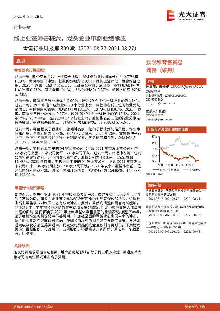 光大证券:零售行业周报第399期:线上业态冲击较大,龙头企业中期业绩承压.pdf