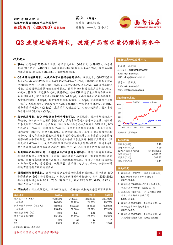 西南证券:迈瑞医疗(300760)-Q3业绩延续高增长,抗疫产品需求量仍维持高水平.pdf