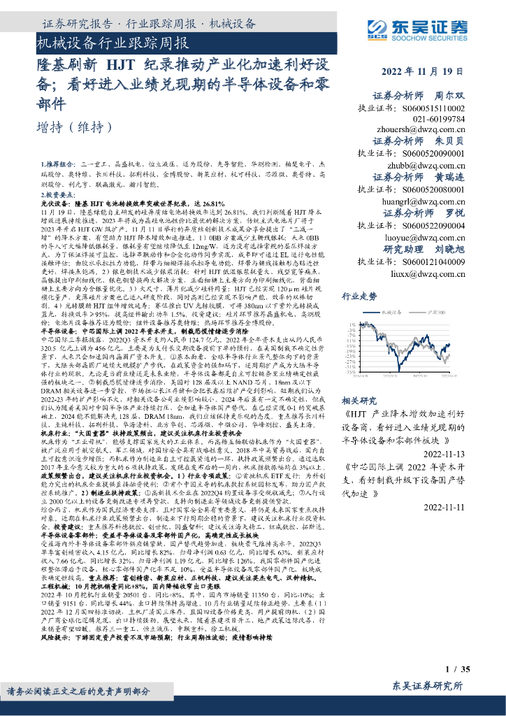 东吴证券:机械设备行业跟踪周报:隆基刷新HJT纪录推动产业化加速利好设备;看好进入业绩兑现期的半导体设备和零部件.pdf