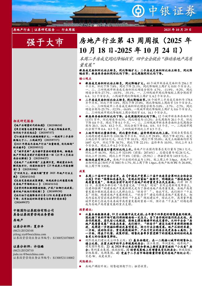 中银证券:房地产行业第43周周报:本周二手房成交同比降幅收窄,四中全会提出“动房地产高质量发展”.pdf