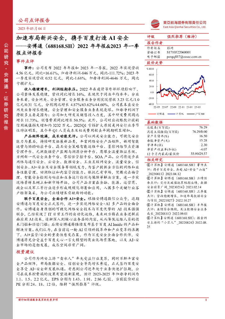 东亚前海证券:安博通(688168)-2022年年报&2023年一季报点评报告:加速布局新兴安全,携手百度打造AI安全.pdf
