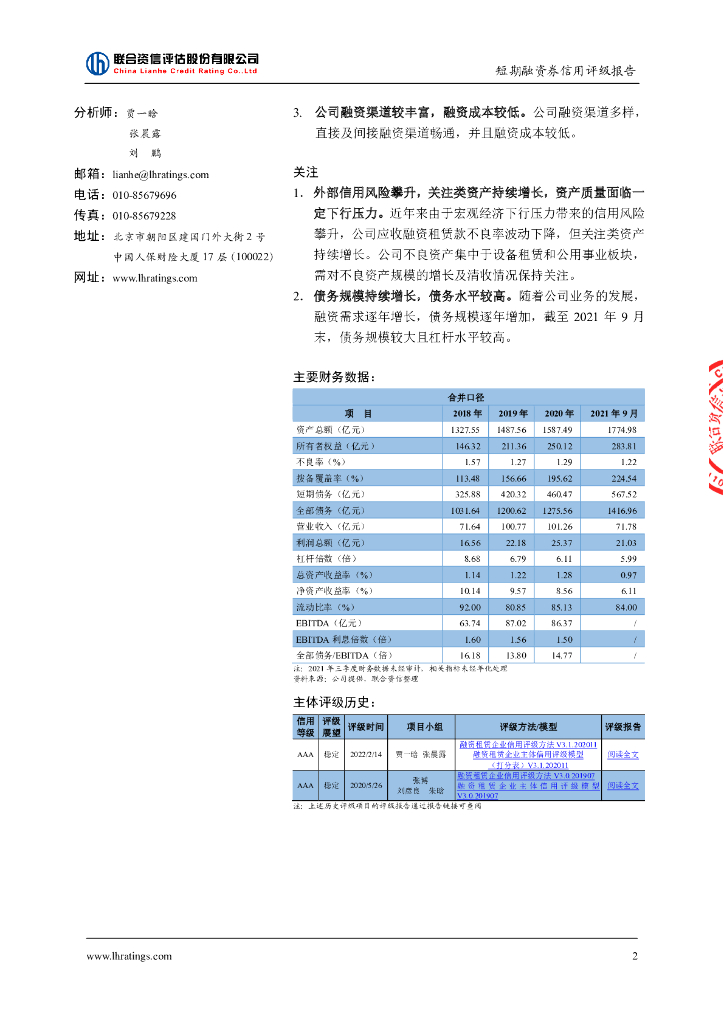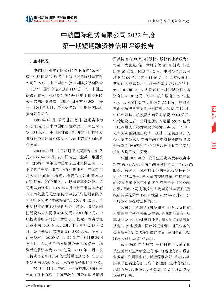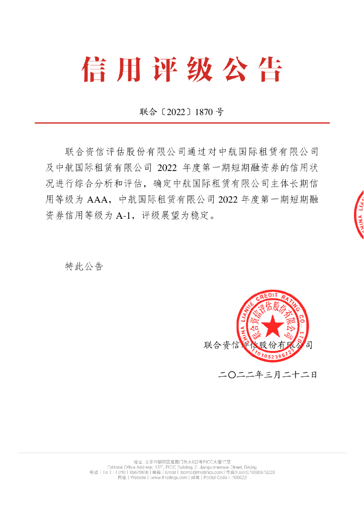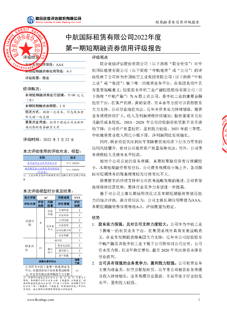 联合资信:中航国际租赁有限公司2022年度第一期短期融资券信用评级报告.pdf