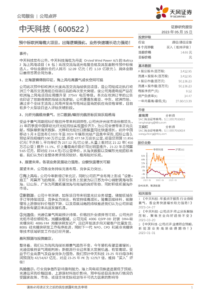 天风证券:中天科技(600522)-预中标欧洲海缆大项目,出海逻辑强化,业务快速增长动力强劲!.pdf