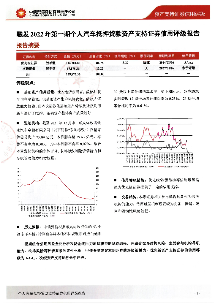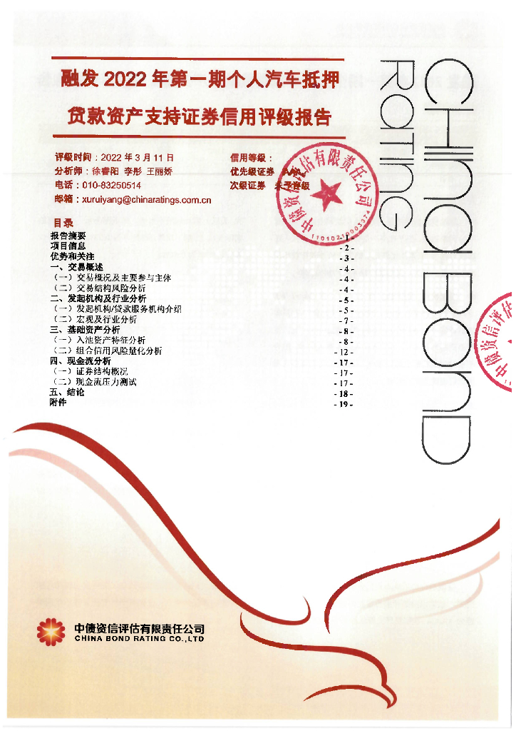 中债资信:融发2022年第一期个人汽车抵押贷款资产支持证券售前评级报告及持续跟踪评级说明.pdf