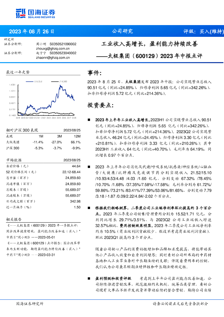 国海证券:太极集团(600129)-2023年中报点评:工业收入高增长,盈利能力持续改善.pdf
