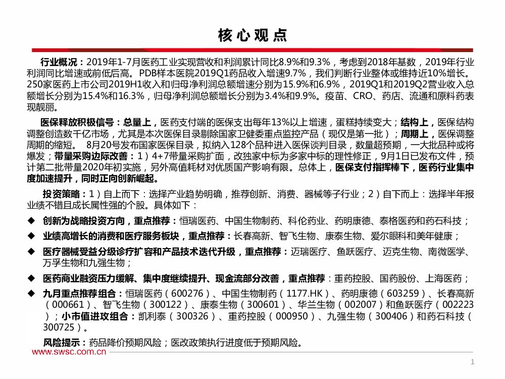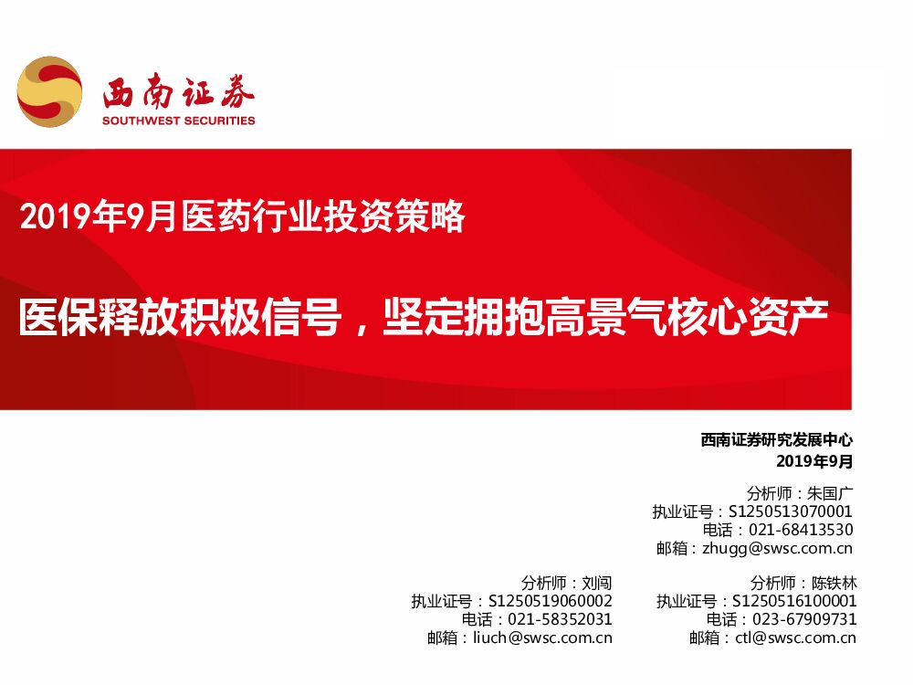 西南证券:2019年9月医药行业投资策略:医保释放积极信号,坚定拥抱高景气核心资产.pdf