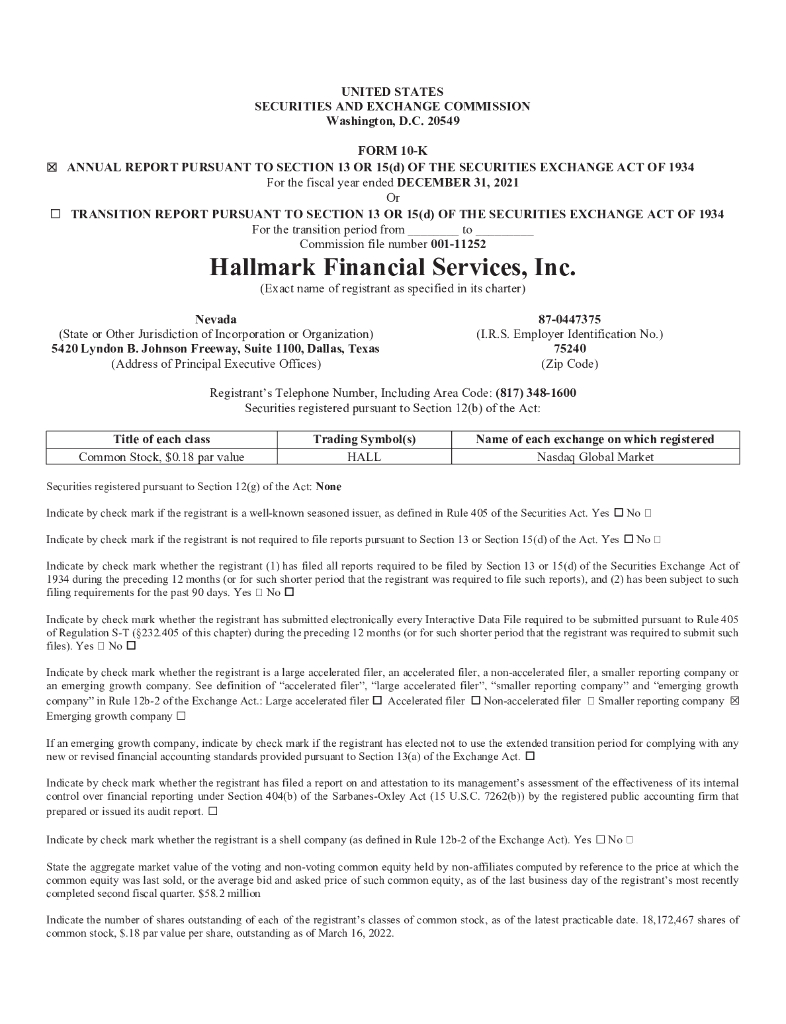 Hallmark Financial Services Inc.(HALL)2021财年年度报告(英文版).pdf
