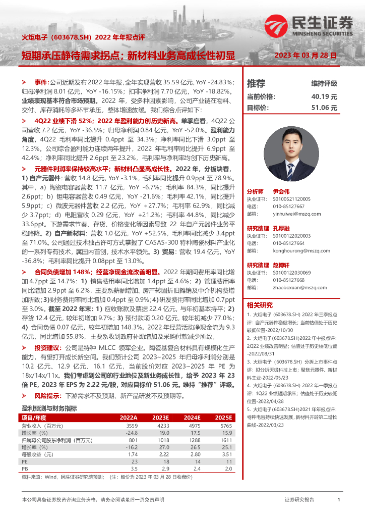 民生证券:火炬电子(603678)-2022年年报点评:短期承压静待需求拐点;新材料业务高成长性初显.pdf