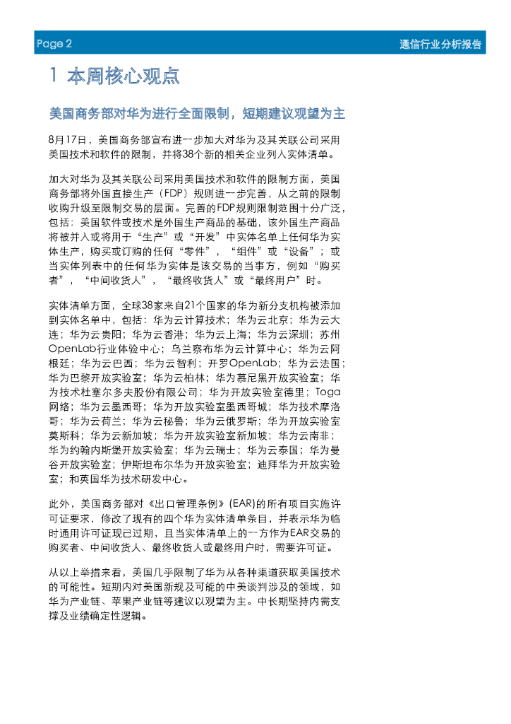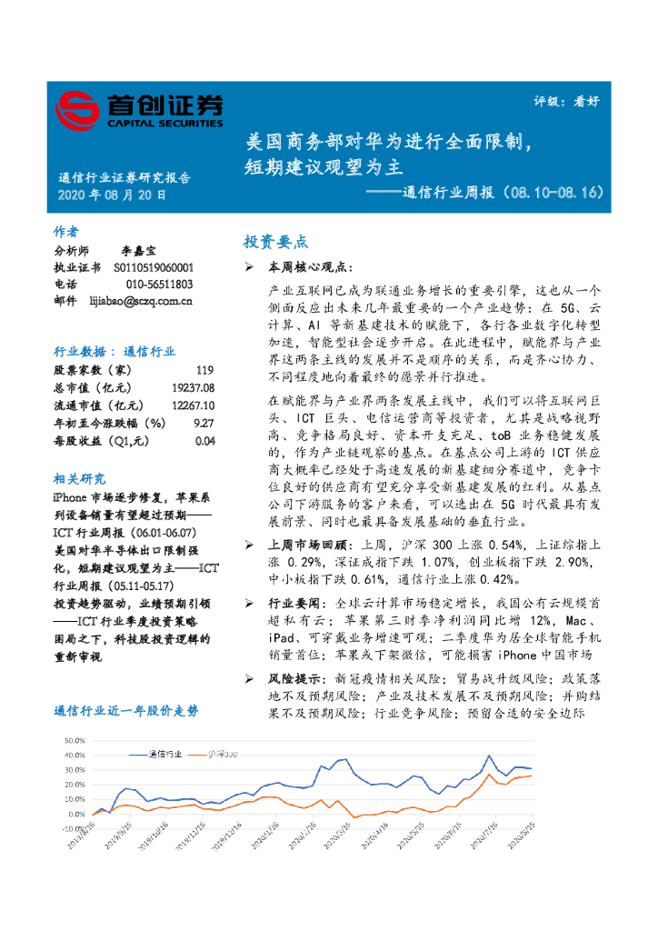 首创证券:通信行业周报:美国商务部对华为进行全面限制,短期建议观望为主.pdf