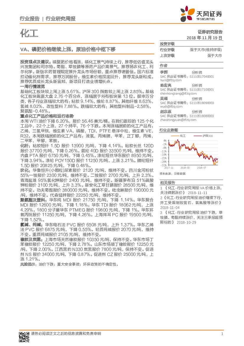 天风证券:化工行业研究周报:VA、磷肥价格继续上涨,原油价格中枢下移.pdf