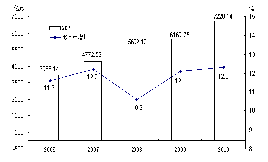 初步核算,2010年全省生产总值(GDP)完成7220.14亿元,比上年增长12.3%,高于全国平均水平2个百分点。分产业看,第一产业增加值1105.81亿元,增长4.0%;第二产业增加值3223.93亿元,增长15.8%;第三产业增加值2890.4亿元,增长11.5%。三次产业结构由上年的17.3:41.9:40.8调整为15.3:44.7:40.0。全省人均GDP达到15749元(按年末汇率折合2378美元),比上年增长11. 6%。非公有制经济创造增加值2931.38亿元,占全省生产总值的比重达40.6%,比上年提高1.5个百分点。