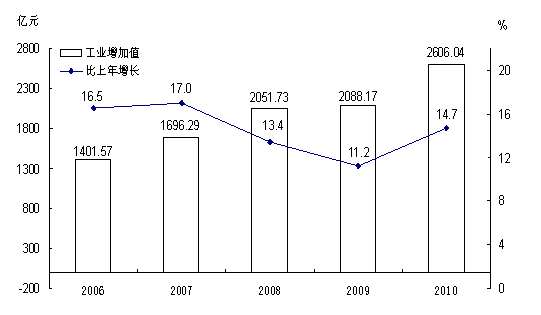 全年全部工业完成增加值2606.04亿元,比上年增长14.7%;规模以上工业完成增加值2246.91亿元,增长15.0%。在规模以上工业中,轻工业完成增加值1037.45亿元,比上年增长15.0%;重工业完成增加值1209.46亿元,增长15.0%。