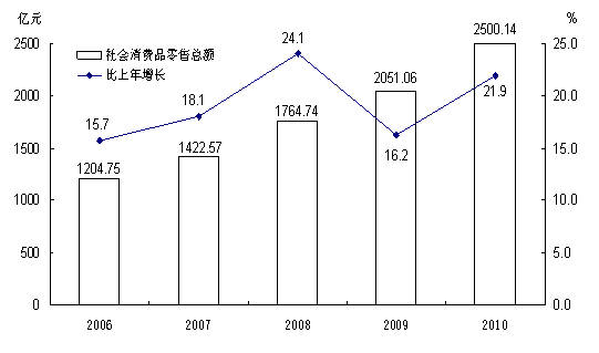 图6 2006-2010年云南省社会消费品零售总额及其增长速度
