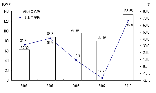 全年外贸进出口总额完成133.68亿美元,比上年增长66.5%。其中出口完成76.06亿美元,增长68.4%,进口完成57.62亿美元,增长64.2%。全年对欧盟进出口14.6亿美元,增长29.5%;对东盟进出口45.75亿美元,增长45.2%;对南亚进出口9.31亿美元,增长72.1%。
