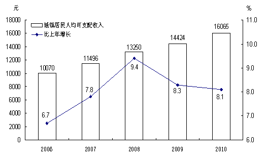 图9 2006-2010年云南省城镇居民人均可支配收入及其增长速度