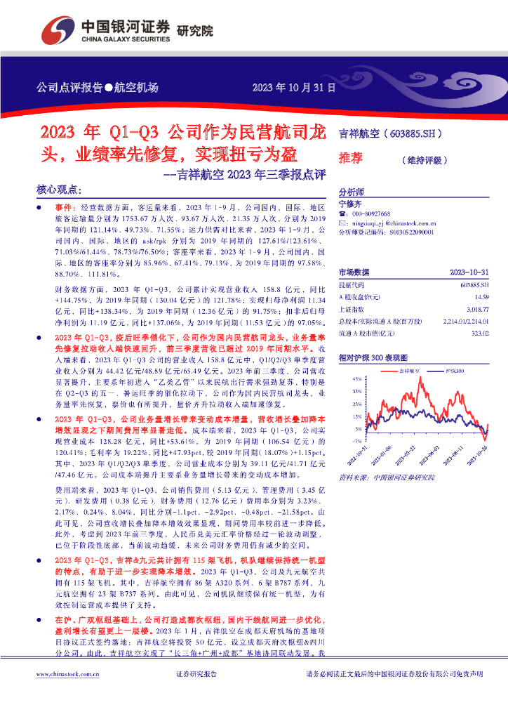 中国银河:吉祥航空(603885)-2023年Q1-Q3公司作为民营航司龙头,业绩率先修复,实现扭亏为盈.pdf