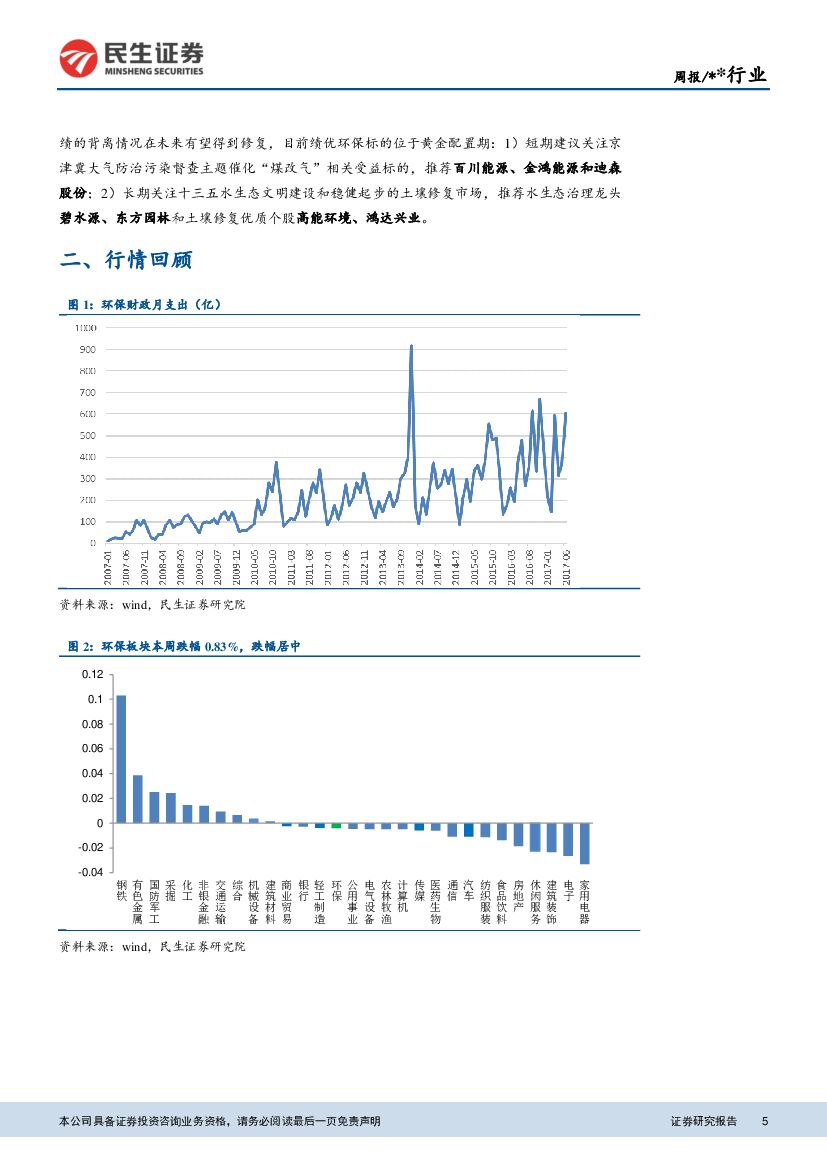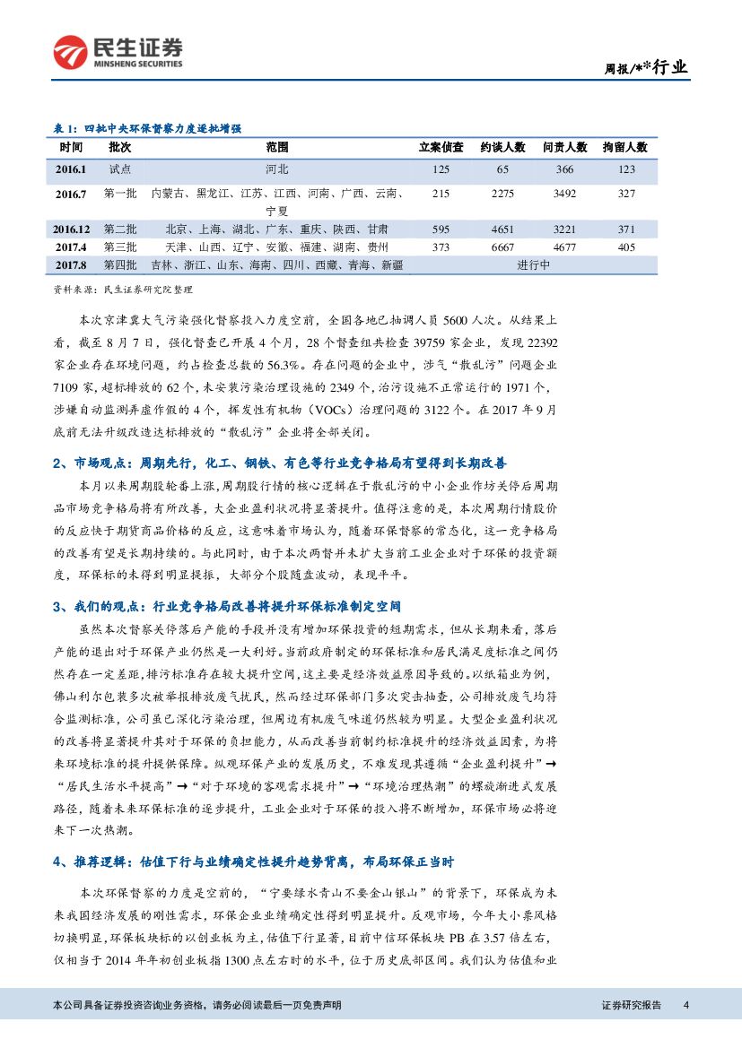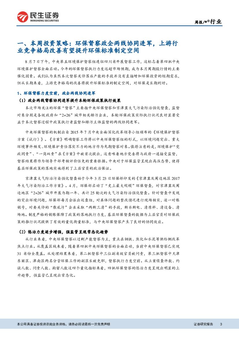 民生证券:环保行业周报:环保督察政企两线协同进军,环保标准制定空间有望提升.pdf