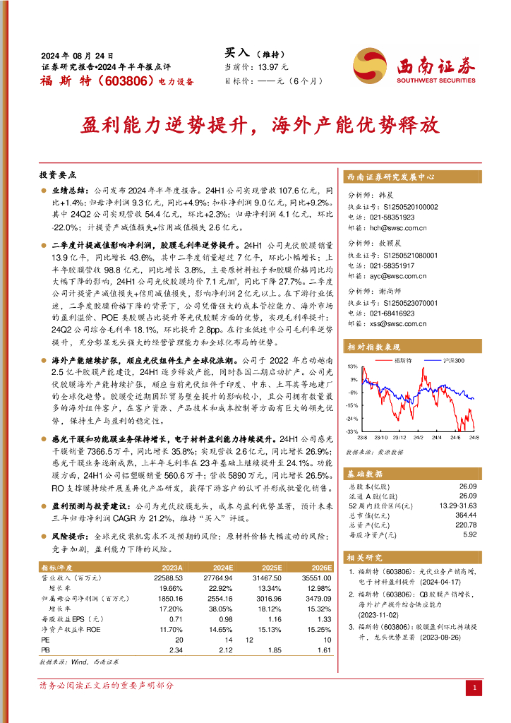 西南证券:福斯特(603806)-2024年半年报点评:盈利能力逆势提升,海外产能优势释放.pdf