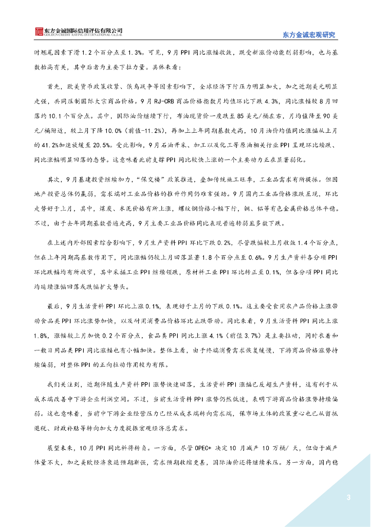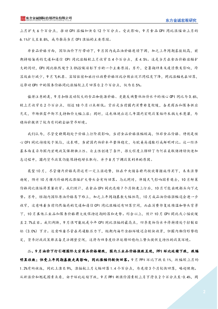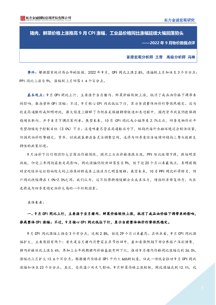 东方金诚: 2022年9月物价点评-猪肉、鲜菜价格上涨推高9月CPI涨幅,工业品价格同比延续大幅回落势头.pdf