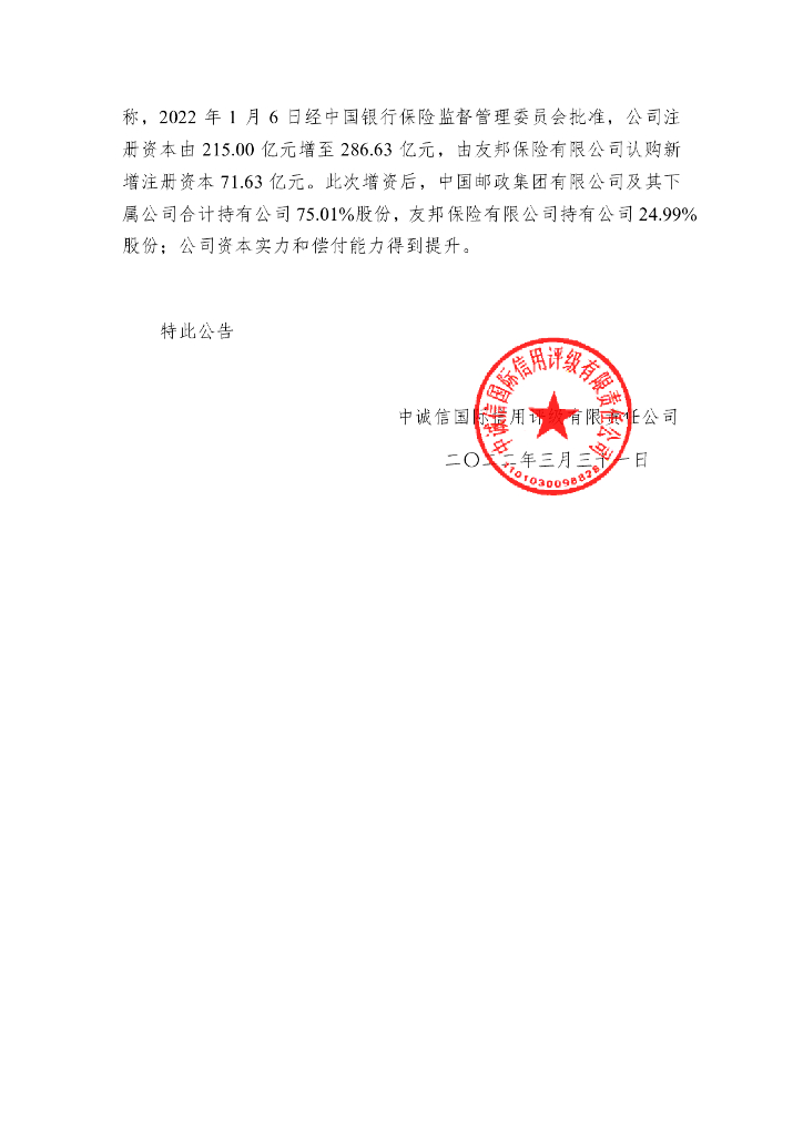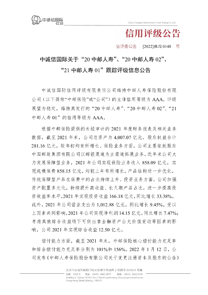 中诚信:中诚信国际关于“20中邮人寿”、“20中邮人寿02”、“21中邮人寿01”跟踪评级信息公告.pdf
