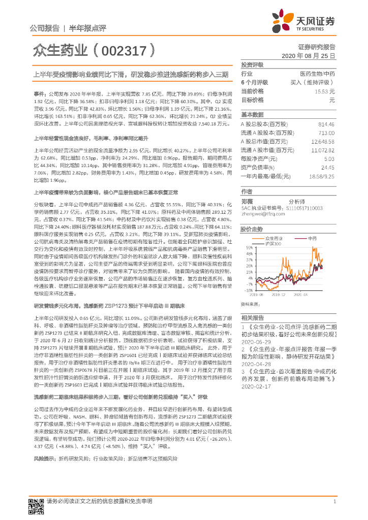 天风证券:众生药业(002317)-上半年受疫情影响业绩同比下滑,研发稳步推进流感新药将步入三期.pdf