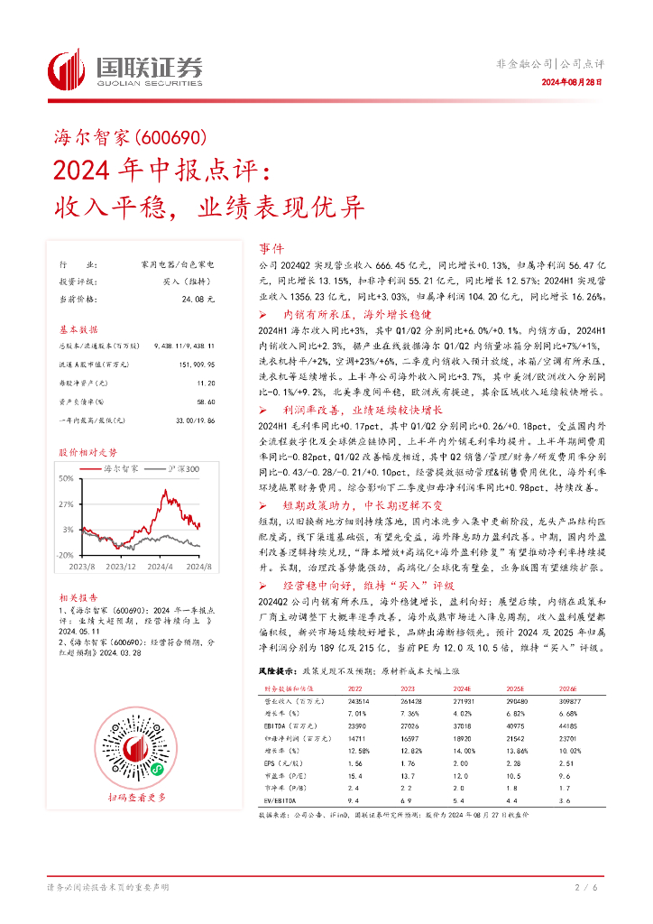 国联证券:海尔智家(600690)-2024年中报点评:收入平稳,业绩表现优异.pdf