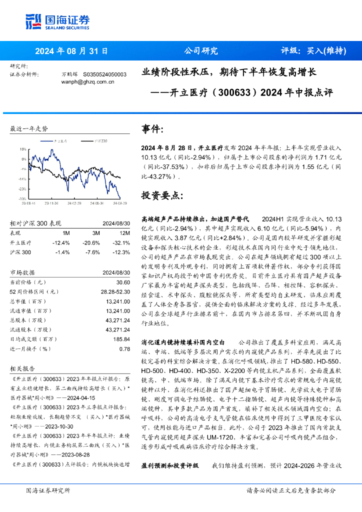 国海证券:开立医疗(300633)-2024年中报点评:业绩阶段性承压,期待下半年恢复高增长.pdf