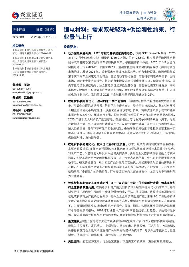 兴业证券:锂电材料:需求双轮驱动+供给刚性约束,行业景气上行.pdf