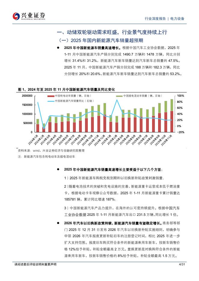 东莞证券:锂电池产业链跟踪点评:2025年12月电池产销量同环比双增长