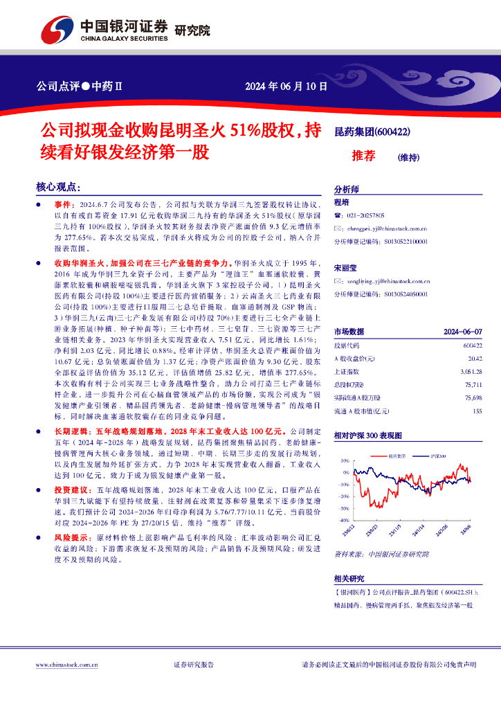 中国银河:昆药集团(600422)-公司拟现金收购昆明圣火51%股权,持续看好银发经济第一股.pdf