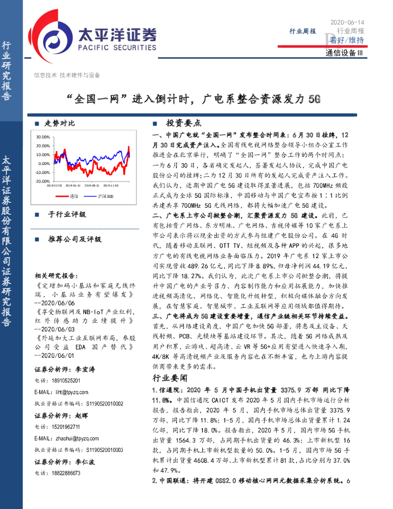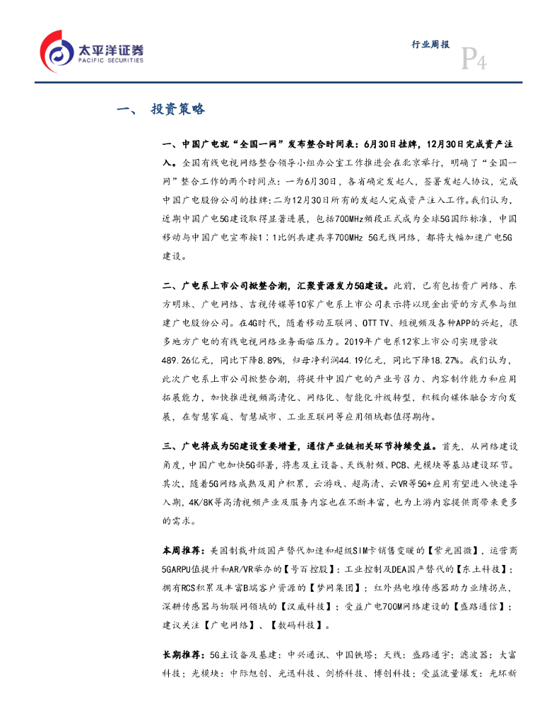 太平洋证券:通信设备Ⅲ行业周报:“全国一网”进入倒计时,广电系整合资源发力5G.pdf