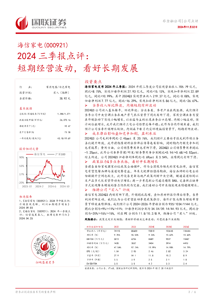 国联证券:海信家电(000921)-2024三季报点评:短期经营波动,看好长期发展.pdf
