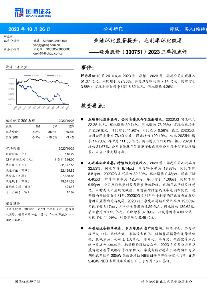 国海证券:迈为股份(300751)-2023三季报点评:业绩环比显著提升,毛利率环比改善.pdf