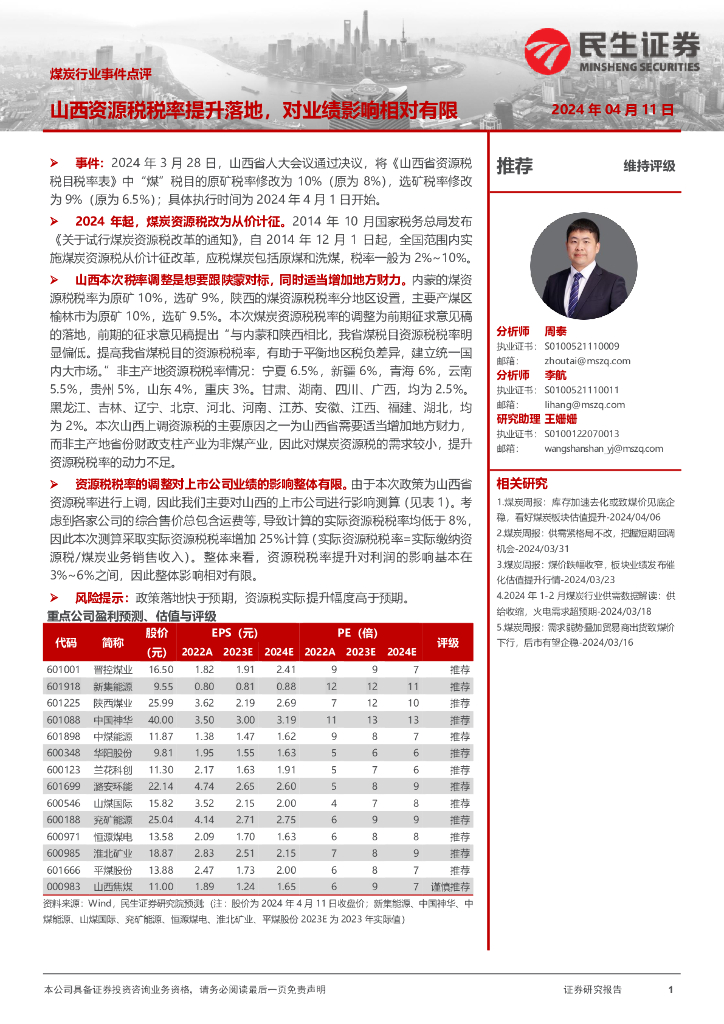 民生证券:煤炭行业事件点评:山西资源税税率提升落地,对业绩影响相对有限.pdf