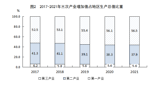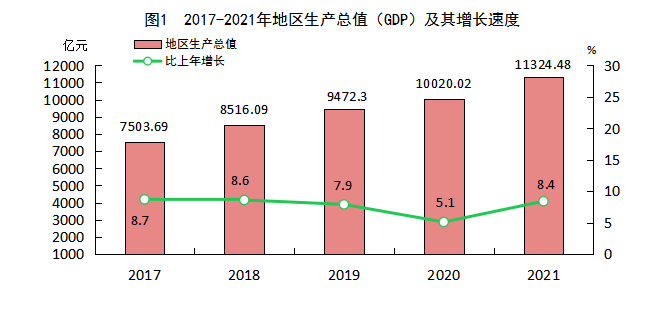 初步核算,全年实现地区生产总值11324.48亿元,比上年增长8.4%。其中,第一产业增加值637.03亿元,增长6.0%;第二产业增加值4289.80亿元,增长7.3%;第三产业增加值6397.66亿元,增长9.3%。第一产业增加值占地区生产总值的比重为5.6%,第二产业增加值比重为37.9%,第三产业增加值比重为56.5%。全年人均地区生产总值135298元,比上年增长7.2%。