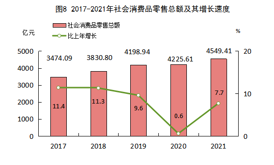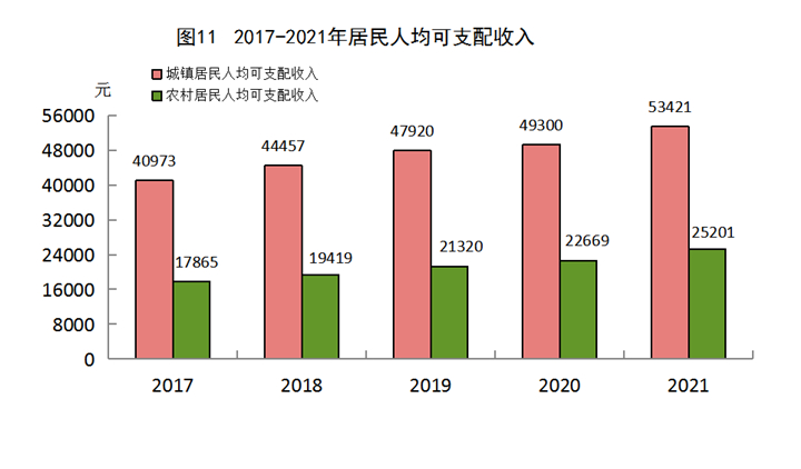 全年居民人均可支配收入44249元,比上年增长9.3%。按常住地分,农村居民人均可支配收25201元,增长11.2%;城镇居民人均可支配收入53421元,增长8.4%。全年居民人均生活消费支出30869元,比上年增长13.2%。按常住地分,农村居民人均生活消费支出20911元,增长18.1%;城镇居民人均生活消费支出35664元,增长11.4%。