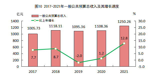 全年一般公共预算总收入1250.26亿元,比上年增长12.8%,其中,地方一般公共预算收入749.85亿元,增长11.0%。一般公共预算支出925.73亿元,增长2.7%。税收收入563.77亿元,增长16.1%。