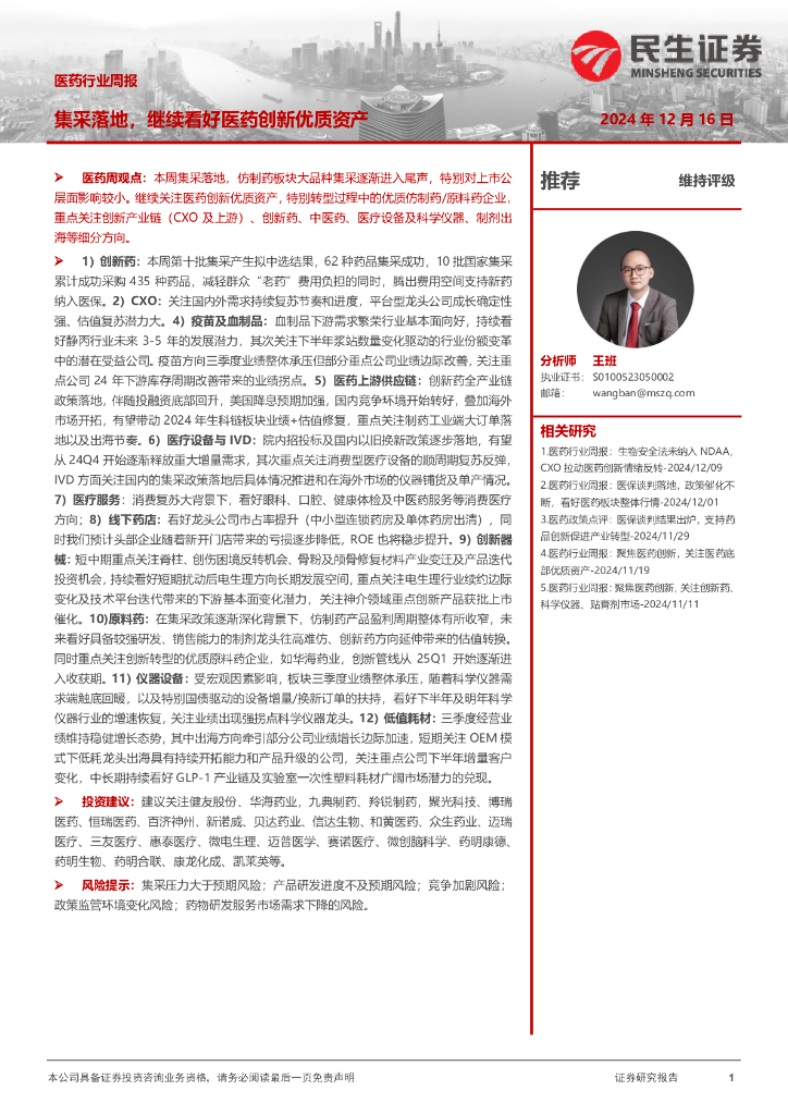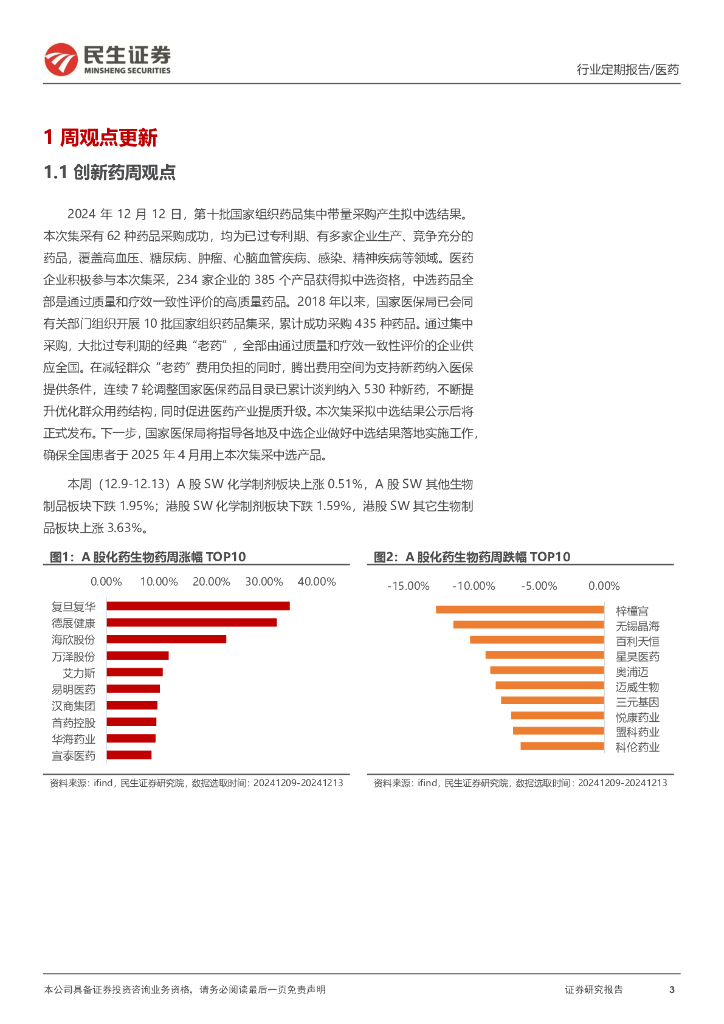 民生证券:医药行业周报:集采落地,继续看好医药创新优质资产.pdf