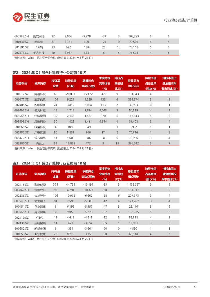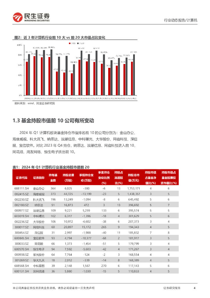 民生证券:计算机行业2024Q1持仓分析:持仓比重回落,集中度提升.pdf
