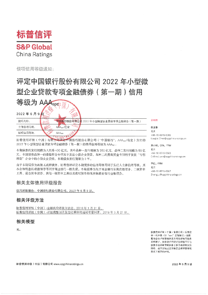 标普信评:中国银行股份有限公司2022年小型微型企业贷款专项金融债券(第一期)信用评级报告及跟踪评级安排说明-标普信评.pdf