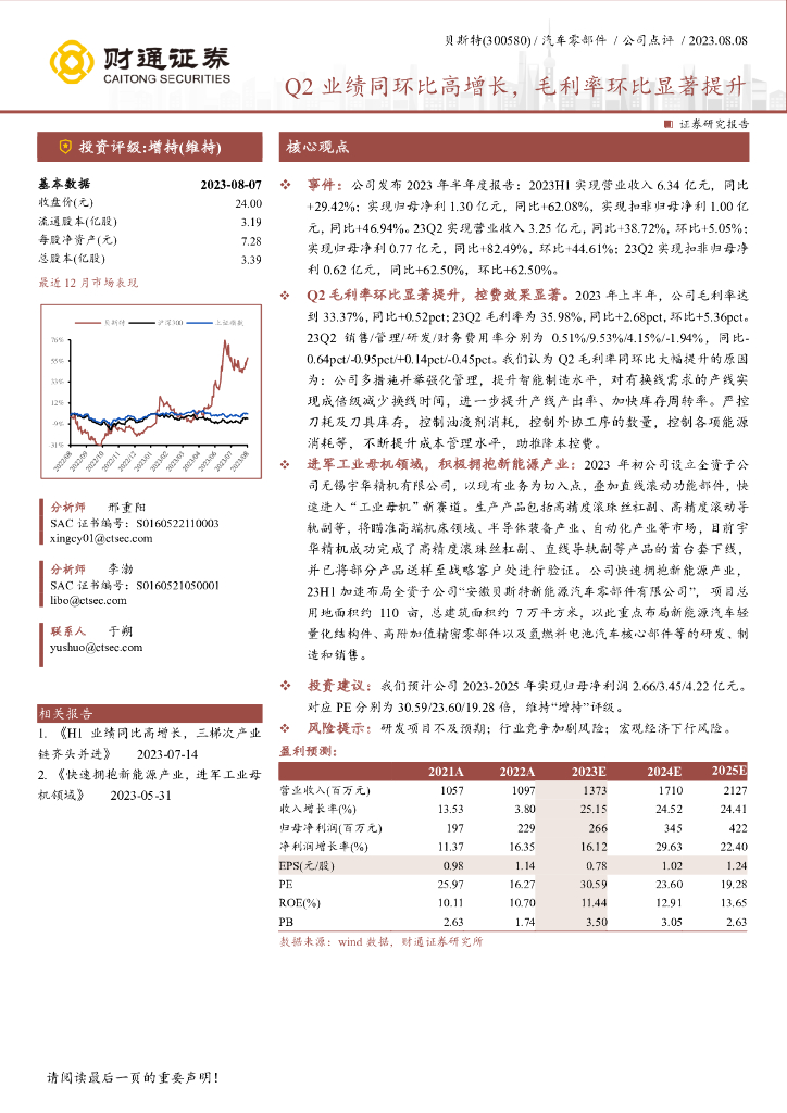 财通证券:贝斯特(300580)-Q2业绩同环比高增长,毛利率环比显著提升.pdf