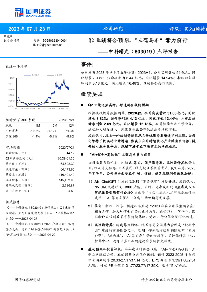 国海证券:中科曙光(603019)-点评报告:Q2业绩符合预期,“三驾马车”蓄力前行.pdf