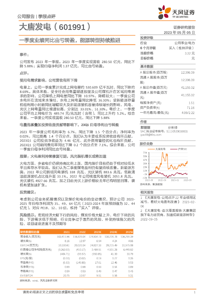 天风证券:大唐发电(601991)-一季度业绩同比由亏转盈, 能源转型持续推进.pdf