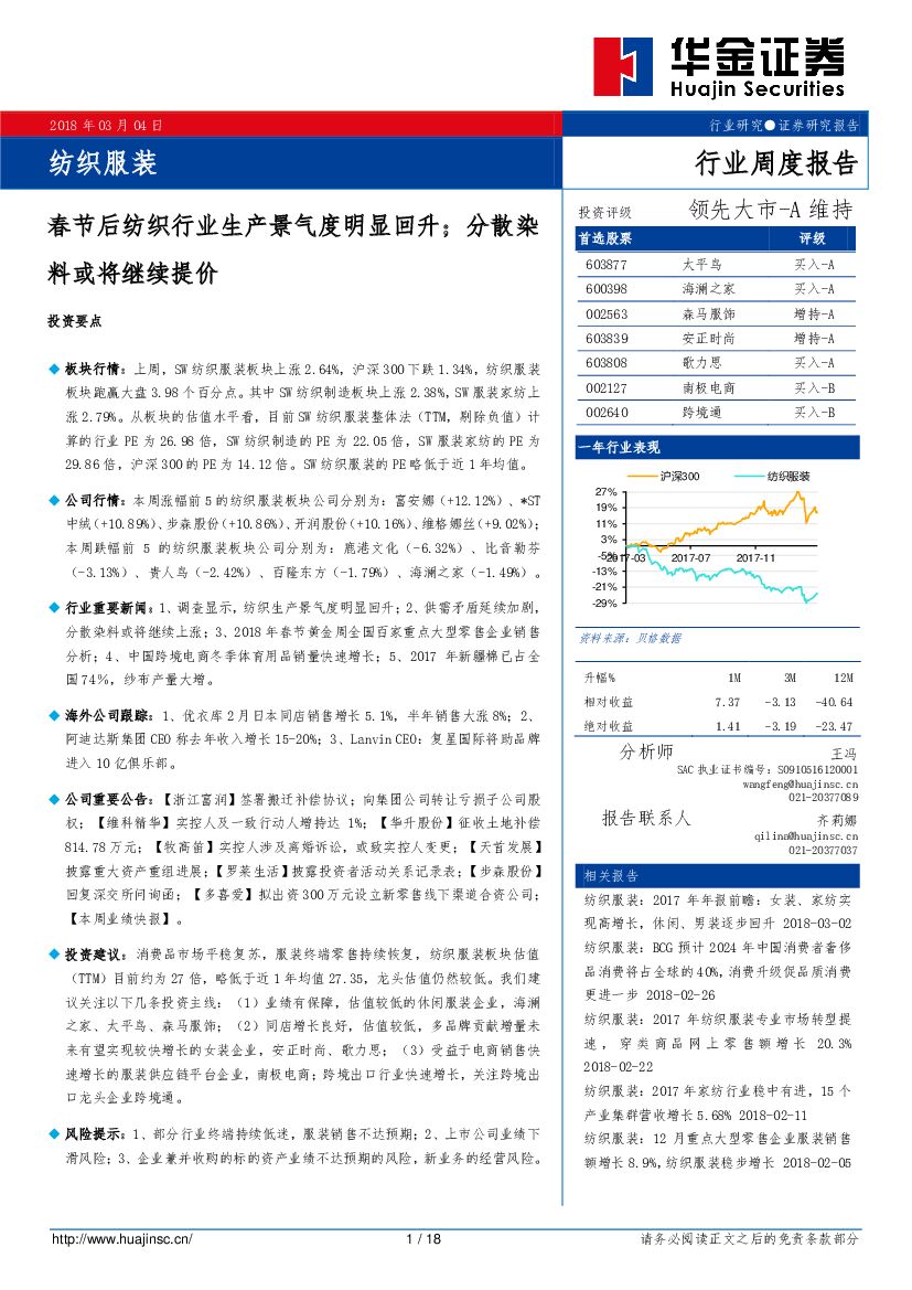 华金证券:纺织服装行业周度报告:春节后纺织行业生产景气度明显回升;分散染料或将继续提价.pdf