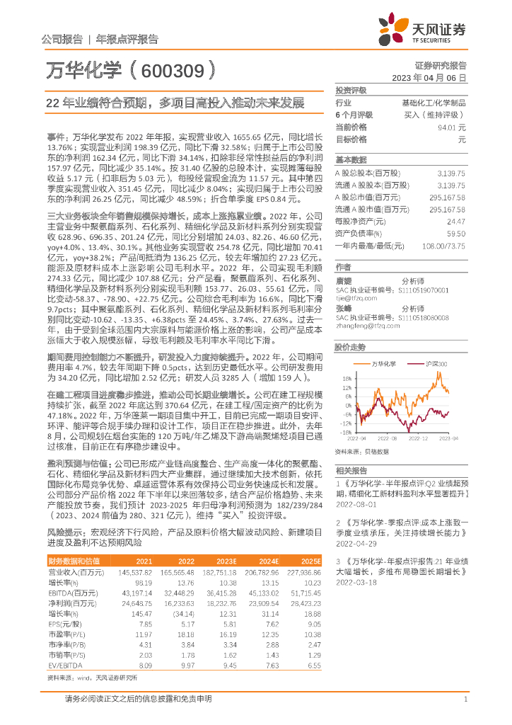 天风证券:万华化学(600309)-22年业绩符合预期,多项目高投入推动未来发展.pdf
