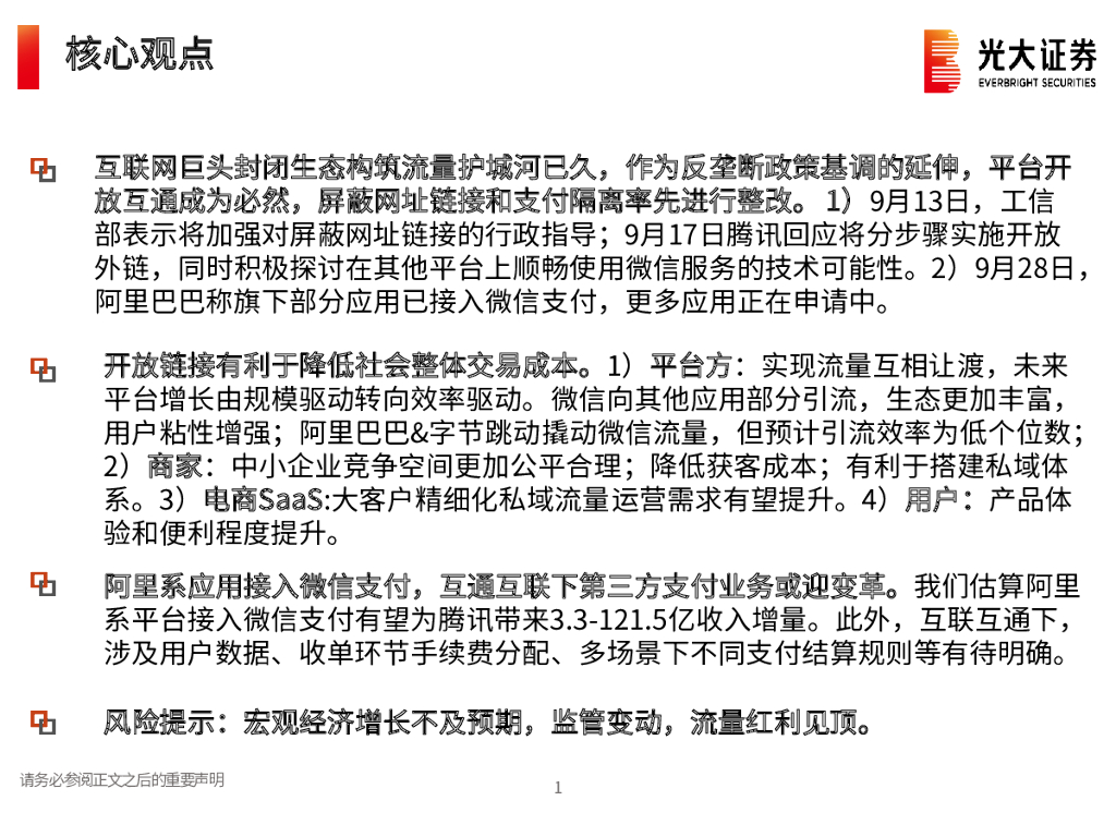 光大证券:光大互联网传媒屏蔽链接和支付隔离整改对各参与方的影响:从围墙花园到互联互通,超级平台走向开放.pdf