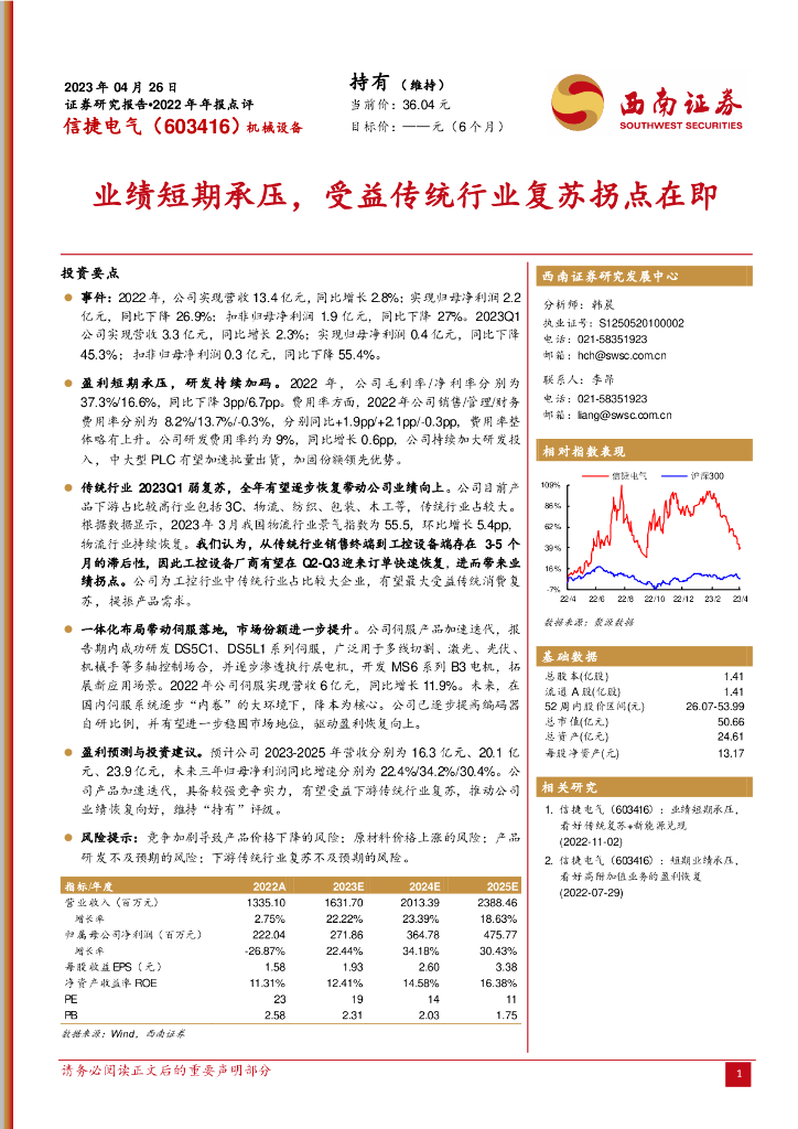 西南证券:信捷电气(603416)-业绩短期承压,受益传统行业复苏拐点在即.pdf