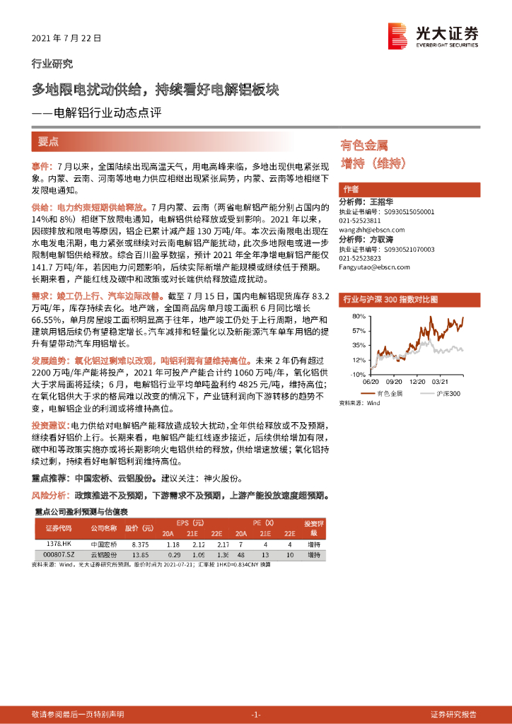 光大证券:电解铝行业动态点评:多地限电扰动供给,持续看好电解铝板块.pdf