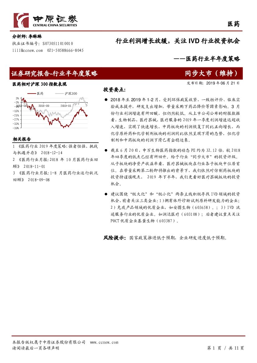 中原证券:医药行业半年度策略:行业利润增长放缓,关注IVD行业投资机会.pdf